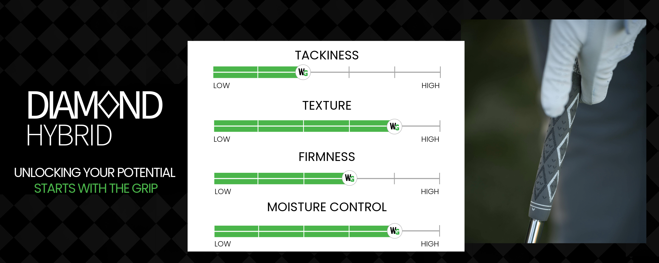 The Diamond Hybrid design features a blend of grip technologies to provide golfers with optimal performance and comfort. The cord combined with the Diamond "Pebble" in the upper hand offer ultimate traction in all-weather conditions. The lower hand features a combination of "Feel Tack" rubber and Diamond "Pebble" to provide control and consistency.
