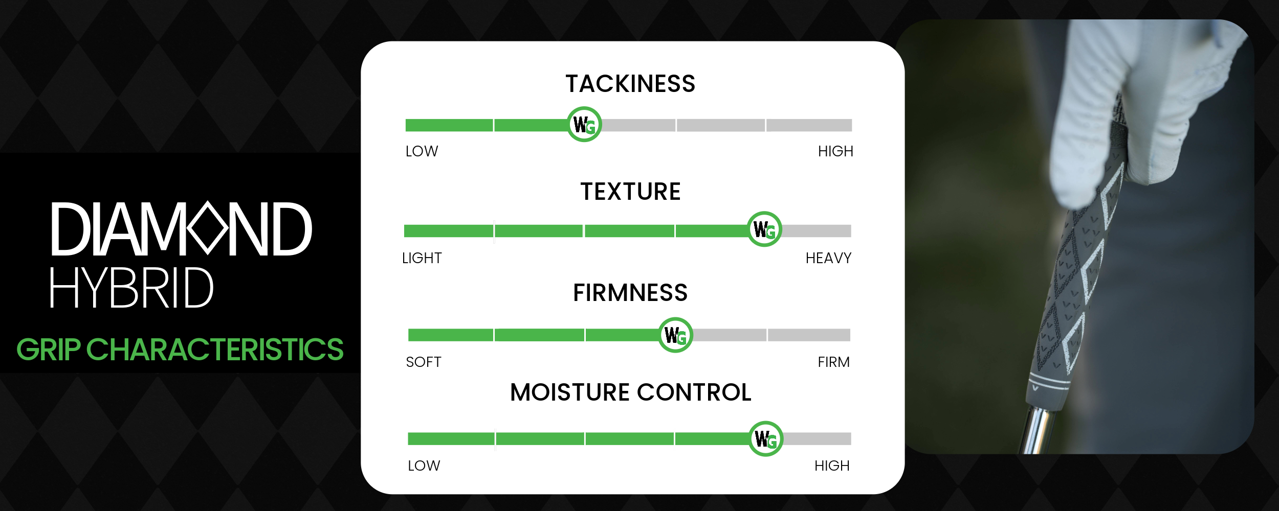 The Diamond Hybrid design features a blend of grip technologies to provide golfers with optimal performance and comfort. The cord combined with the Diamond "Pebble" in the upper hand offer ultimate traction in all-weather conditions. The lower hand features a combination of "Feel Tack" rubber and Diamond "Pebble" to provide control and consistency.
