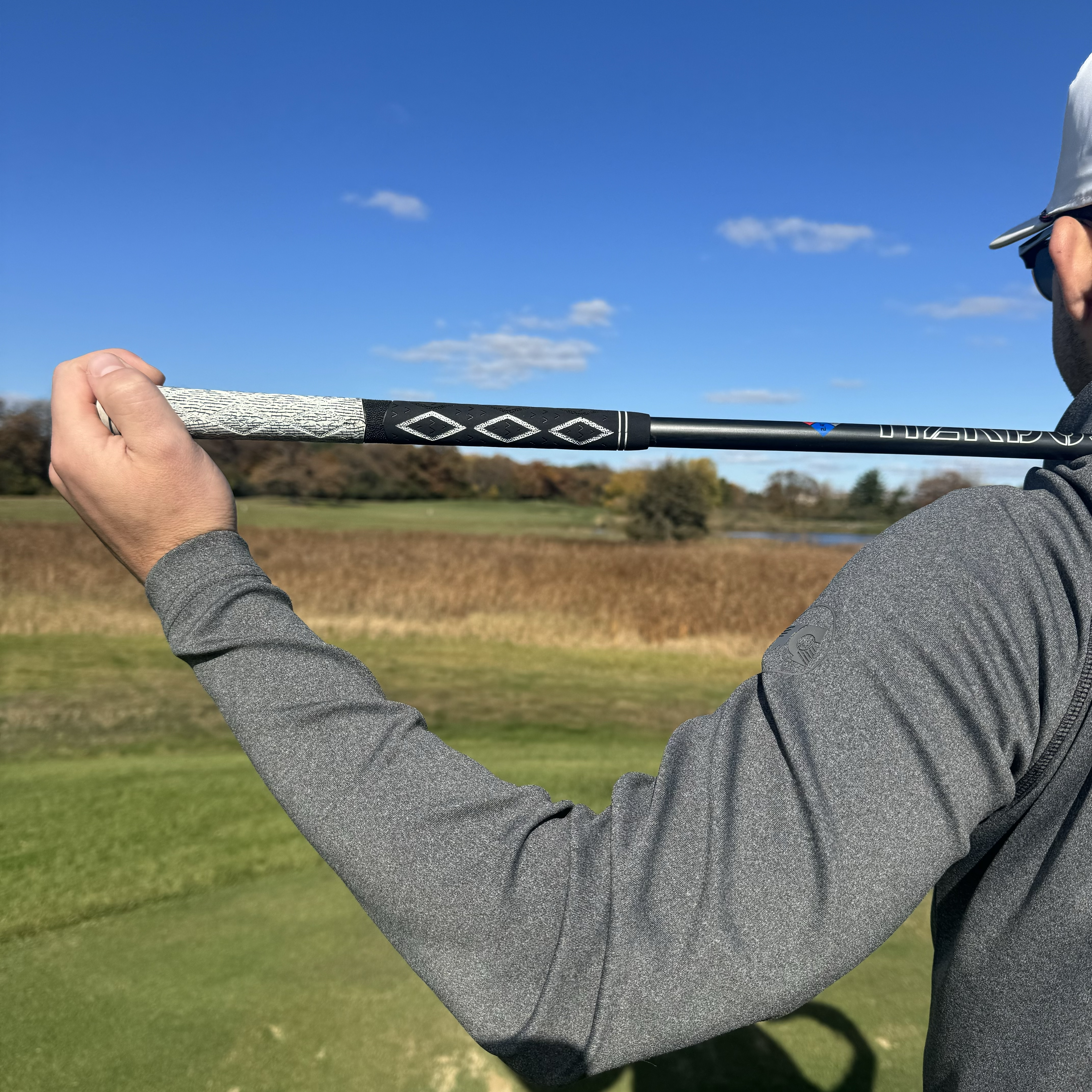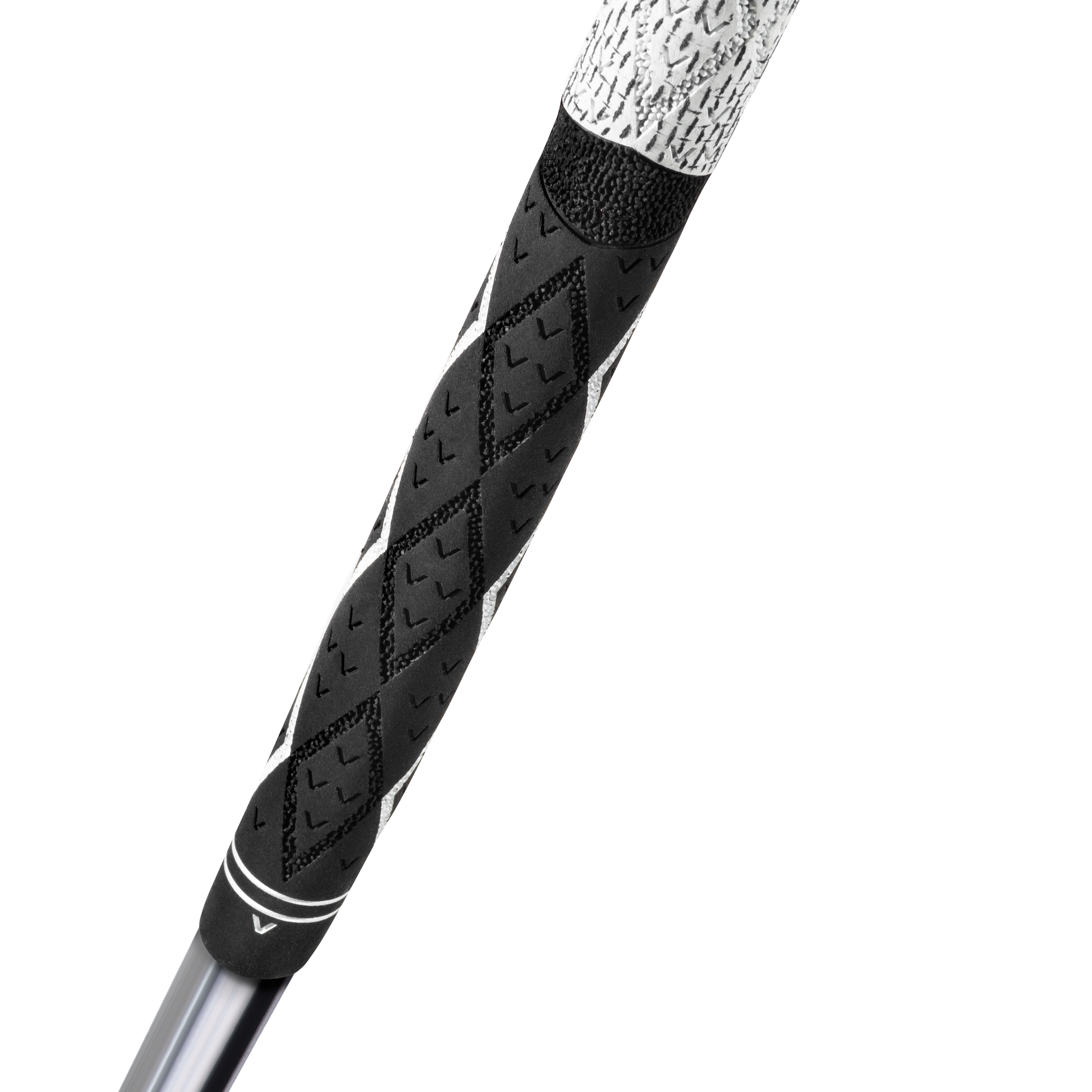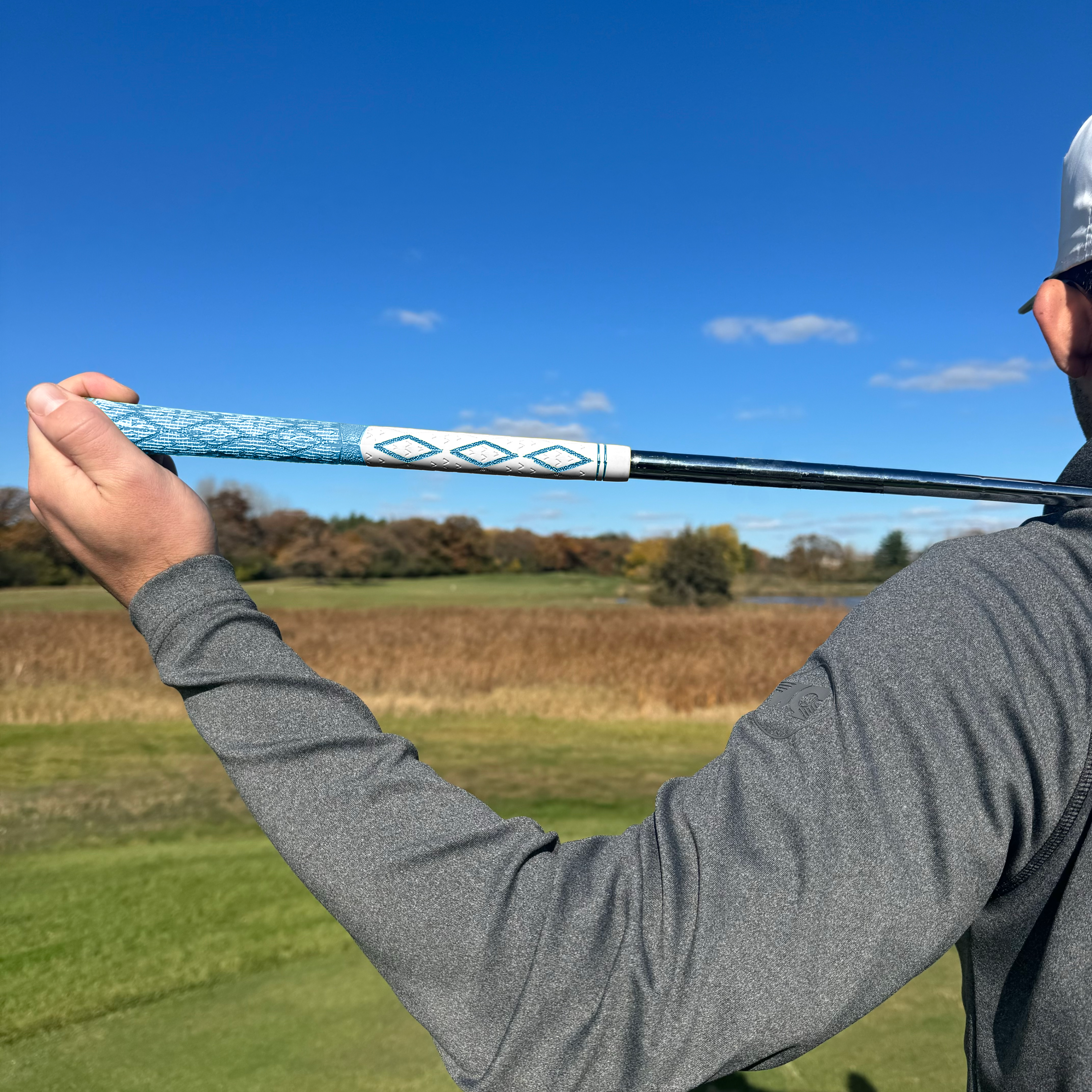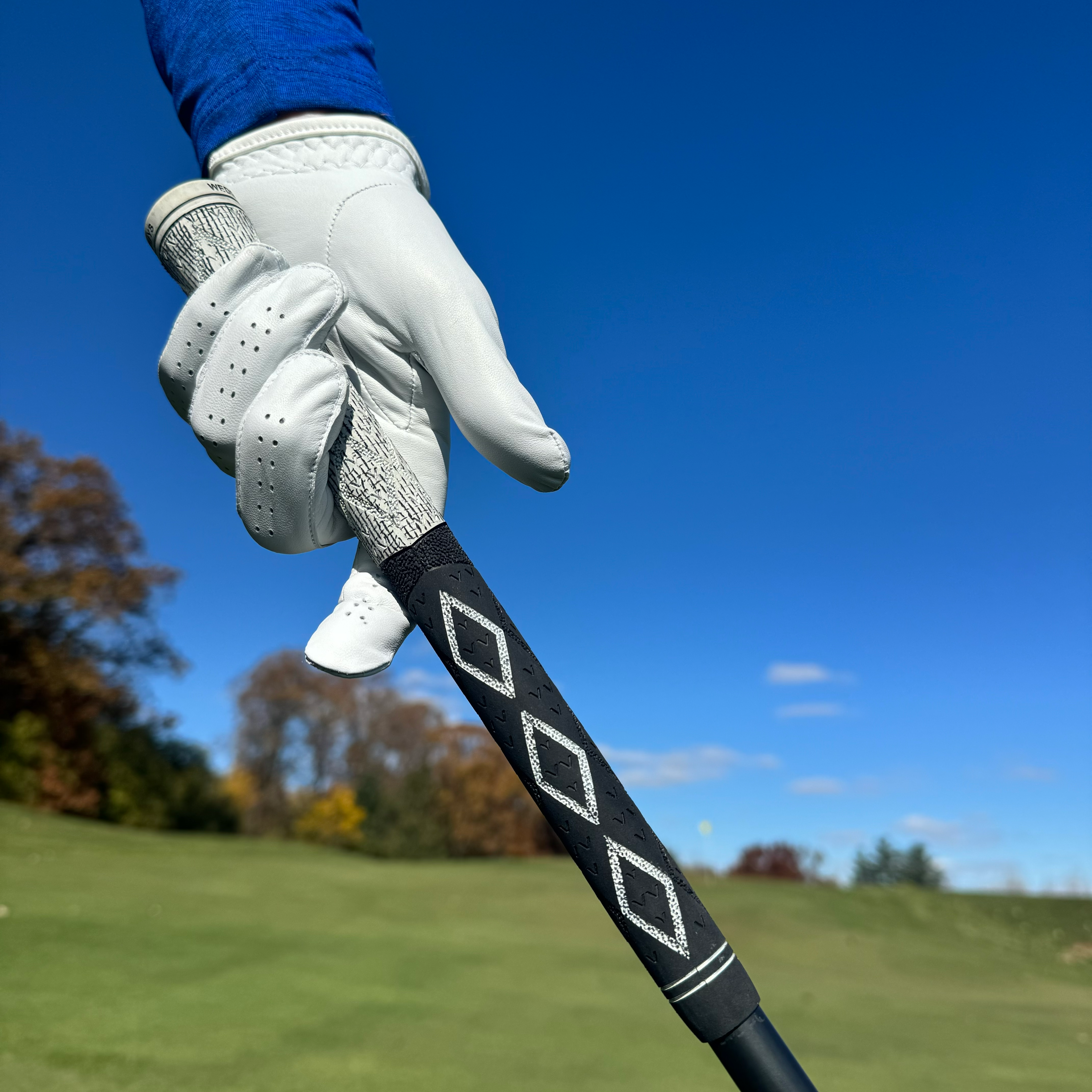 The Diamond Hybrid design features a soft woven cord combined with a Diamond “Pebble” in the upper hand offering the ultimate in traction in all weather conditions.  The lower hand features a combination of “Feel Tack” rubber with Diamond “Pebble” to provide control and consistency for all shot types.