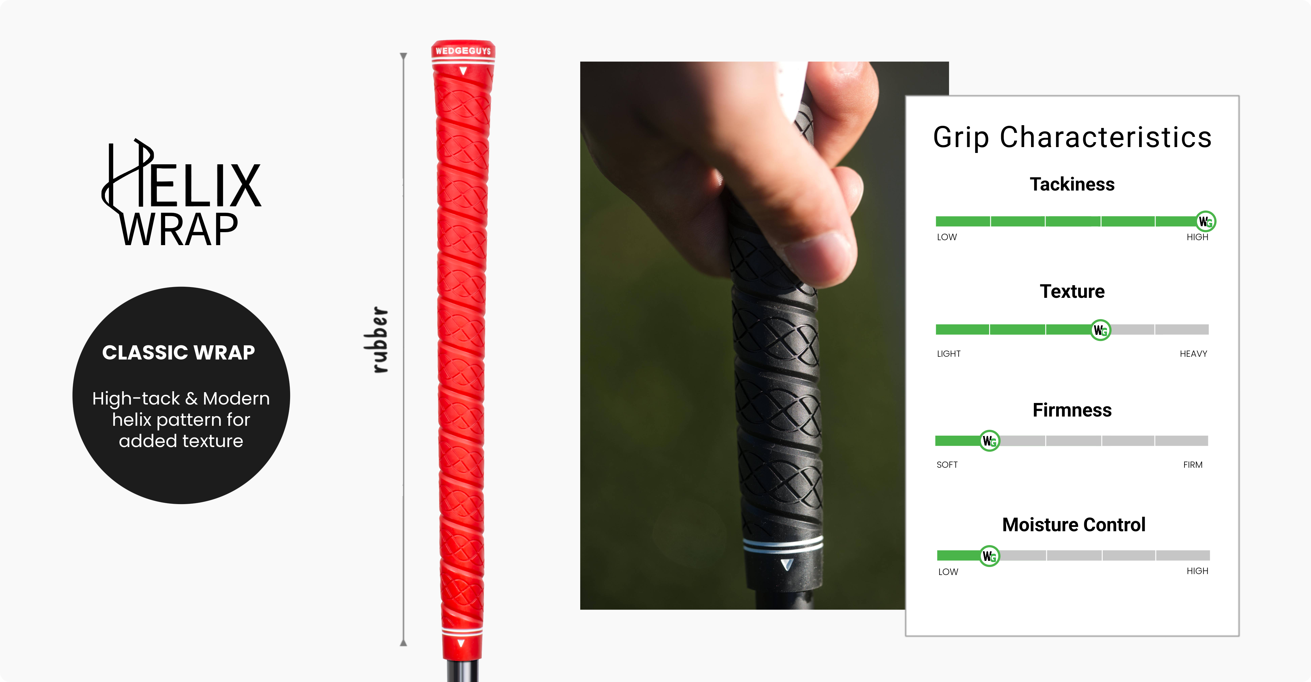 The Helix Wrap by Wedge Guys features a traditional wrap-style design that contours to your hands for a secure, customized feel. Its enhanced softness and added texture provide improved comfort, feedback, and traction throughout your swing.
